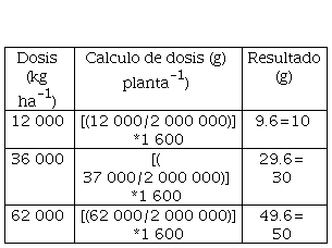 El cálculo se basó en tres dosis de 12 000 kg ha-1, 37 000 kg ha-1 y 62 000 ha-1 de biocarbón de cacao para una población de 1 600 plantas/ha-1 (tabla 2):