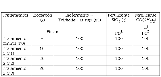 Para este estudio, se delimitó 2 ha de cultivo de banano en cada finca, donde se dividió en cuatro partes iguales (4 parcelas para el estudio). Se asignó tres tratamientos y un tratamiento control. En cada parcela se seleccionó diez plantas (unidades experimentales) en fase juvenil de 1.1 a 1.3 m de altura, las cuales recibieron los tratamientos. En el caso de la FO, se complementó con SiO. (dióxido de silicio) y en el de la FC, CO(NH.).) (urea). Los tratamientos para las fincas bananeras constan en la tabla 3: