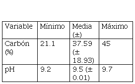 En la tabla 4 se presenta un porcentaje de carbón del 37.59 % y valores extremos de 21.1 % a 45 %. La media del pH de 9.5 corresponde a un valor altamente alcalino, al igual que los valores extremos (pH 9.2-9.7).