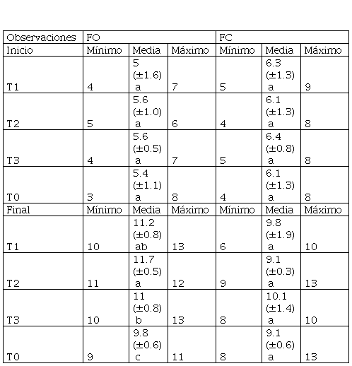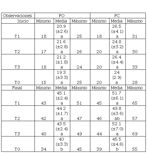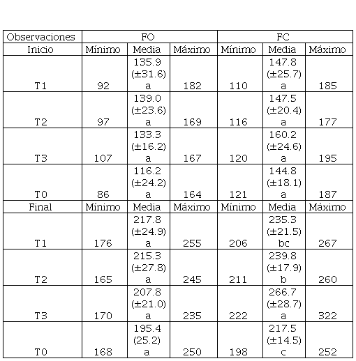 En la FC tampoco se obtuvo diferencia significativa (p>0.05) en la observación inicial. Los valores mínimos y máximos tuvieron un rango mayor con respecto al T0 (121 cm-187 cm) al comparar con los registros del T1 (110 cm-185 cm) y del T3 (120 cm-195 cm). El valor más alto de la media fue de 160.2 cm (T3), seguido de 147.5 cm (T1) y 147.8 cm (T2), y en el T0 de 144.8 cm. En la observación final, los tratamientos sí mostraron diferencias significativas (p≤0.05) entre el T3 con el mayor valor de 266.7 cm, seguido del T2 (239.8 cm), el T1 (235.3 cm) y el T0 (217.5 cm). Los valores mínimos y máximos no se acortaron, por lo contrario, la variación se incrementó en el T3 (de 222 cm a 322 cm).