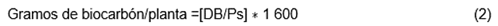 Al no encontrar una referencia de dosis óptima de biocarbón obtenido de mazorca de cacao para utilizarla en suelos francoarenosos para banano, se tomó como referencia la Ec. (2) recomendada por Pérez Salas et al. (2013). Para determinar la cantidad de biocarbón por planta, se calculó el peso del suelo de una hectárea a una profundidad de 0.20 m y una densidad aparente de 1.0 g cm-3 (1 000 kg m-3).