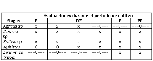 Las evaluaciones de las plagas insectiles dentro del área en estudio se realizaron con una frecuencia de cada siete días, desde la siembra hasta la cosecha del cultivo. Los promedios se registraron según la etapa fenológica del cultivo: Emergencia (E), desarrollo fenológico (DF1, DF2, DF3), floración (F) y fructificación (FR), con un total 6 evaluaciones durante todo el periodo del cultivo.