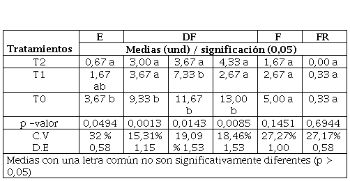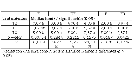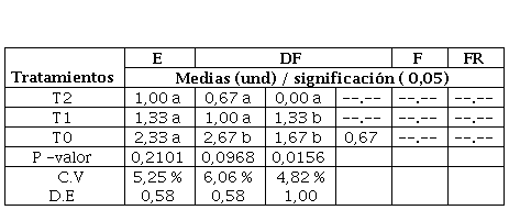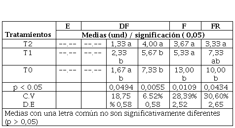 El registro de la presencia de los trips ocurre desde la etapa de la emergencia hasta la fructificación del cultivo, siendo menor las poblaciones en las parcelas tratadas con el T2 y T1, con promedios de entre 0,67 a 4,33 y 1 a 6 trips/planta respectivamente, el tratamiento testigo alcanza promedios superiores (P< 0,05) en todas las fechas evaluadas (entre 3 a 9,67 trips/planta). Se sabe que el umbral de acción de esta plaga es de 5 adultos por planta (Baca y Ríos, 2006) Tabla 5.