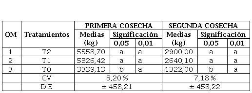 EL tratamiento T2 registra promedios de rendimiento de 5 558, 70 kg/ha en la primera cosecha y de 2900,00 kg/ha en la segunda cosecha y en el T1 se registró 5 326,42 y 2640,10 kg/ha y en la primera y segunda respectivamente. No existen diferencias estadistas significativas entre los tratamientos, en contraste con el T0 de menor rendimiento con 3 339,13 kg/ha y 1 322,00 kg/ha respectivamente y con diferencia estadística frente al resto Tabla 7.