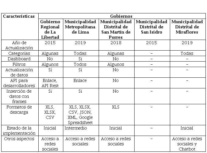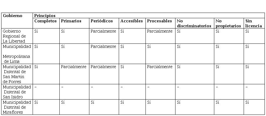 Según la tabla 1, en primer lugar, la Municipalidad Metropolitana de Lima cumple con todos los principios de los datos abiertos, tomando en cuenta que la actualización sobre la publicación de sus datos es hasta 2019, en segundo lugar, el Gobierno Regional de La Libertad cumple con al menos seis de los principios de los datos abiertos, en tercer lugar, la Municipalidad Distrital de San Martín de Porres cumple con al menos cinco de los principios de los datos abiertos, en cuarto lugar, la Municipalidad Distrital de Miraflores, cumple con todos los principios de los datos abiertos, no obstante, esto no se debe a su propia implementación, sino que se debe a su vinculación con el portal de datos abiertos del Gobierno del Perú (Plataforma Nacional de Datos Abiertos, 2018), como un repositorio de datos (Royo-Montañés y Benítez-Gómez, 2019), finalmente, aunque la Municipalidad Distrital de San Isidro afirme que poseen un portal de datos abiertos, este no se encuentra disponible en internet.