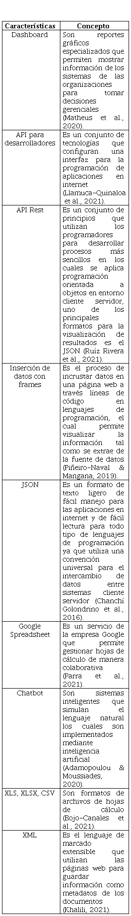 A su vez, es necesario establecer algunos de los conceptos de las principales características que poseen los portales de datos abiertos en los gobiernos regionales y locales del Perú de acuerdo al siguiente detalle tabla 2: