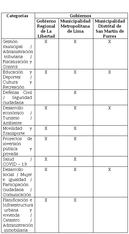Según la tabla 4, la Municipalidad Metropolitana es la que posee más categorías implementadas en su portal de datos abiertos, a pesar de del poco tiempo que lleva la implementación de su portal de datos abiertos , el Gobierno Regional de La Libertad posee casi todas las categorías implementadas a excepción de la categoría de Defensa Civil / Seguridad Ciudadana, finalmente, la Municipalidad Distrital de San Martín de Porres solo tiene implementado las categorías de Gestión municipal / Administración tributaria / Fiscalización y Control, Educación y Deportes / Cultura y Recreación, Desarrollo económico / Turismo / Ambiente y Desarrollo social / Mujer ei / Participación ciudadana / Comunicación.