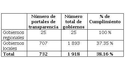 Según la tabla 5, hasta el año 2020 existían 707 gobiernos locales (Tafur-Puerta, 2022) y 25 gobiernos regionales haciendo un total de 732 gobiernos que posee un portal de transparencia (INEI, 2020), el número de gobiernos regionales es de 25 y el número de gobiernos locales es de 1893, haciendo un total de 1917 gobiernos, finalmente, el porcentaje de cumplimiento del principio de transparencia en los gobiernos regionales es de 100 %, a nivel de gobiernos locales es del 37.35 % y a nivel de ambos, es del 38.16 %.