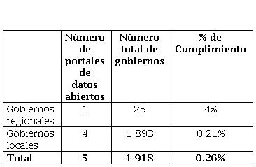 Según la tabla 6, 1 gobierno regional posee un portal de datos abiertos frente al total de 25 gobiernos regionales, esto hace un total de 4 % del cumplimiento del principio de datos abiertos a este nivel de gobierno, luego, cuatro gobiernos locales poseen un portal de datos abiertos frente al total de 1893 gobiernos locales, esto hace un total de 0.21 % del cumplimiento del principio de datos abiertos a este nivel de gobierno, finalmente, existe un total de cinco gobiernos regional y locales que poseen un portal de datos abiertos frente un total de 1918 de gobiernos regionales y locales, esto hace un total del 0.26 % de cumplimiento del principio de datos abiertos en el Perú.