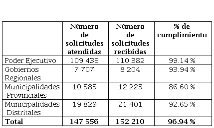 Según la tabla 7, hasta el año 2020 existían, a nivel del poder Ejecutivo, 109 435 solicitudes atendidas de acceso a la información pública, a nivel de gobierno regional, 7707 solicitudes atendidas, a nivel de municipalidades provinciales, 10 585 solicitudes atendidas y a nivel de municipalidades distritales, 19 829, haciendo un total de 147 556 solicitudes atendidas de acceso a la información pública, de un total de 152 210 solicitudes recibidas, esto representa un 96.94 % de cumplimiento (Autoridad Nacional de Transparencia y Acceso a la Información Pública, 2020).