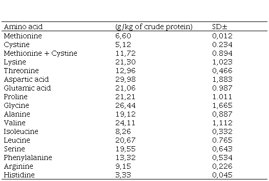 The results for amino acid (table 3) coincide with those reported by Fuentes-Martinez et al. (2019) which reported low concentrations of essential amino acids, when compared to other plant sources such as Phaseolus lunatus, Vigna unguiculata, Cajanus cajan and Vigna radiata with amounts of 42-122 g/kg of protein. These differences are due to the intrinsic characteristics of each species, management, age, part of the plant and geographic area (Miquilena & Higuera-Moros, 2012; Marrugo-Ligardo et al., 2016).