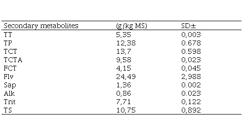 Regarding the results of the concentration of secondary compounds (table 2), low amounts of 5.35 were found; 12.38; 13.7; 9.58; 4.15; 24.49; 0.86; 1.36; 7.71 and 10.75 g/kg MS for TT, TP, TCT, TCTA, FCT, Flv, Sap, Alk, Trit and TS, respectively; which can be considered low compared to other species.