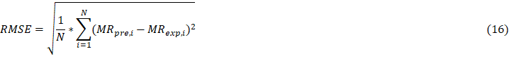Se utilizaron ocho modelos de secado: Lewis, Page, Page modificado, Henderson y Pabis, logarítmico, Midilli, Peleg y Wang & Singh para describir la cinética de secado de las hojas de muña durante los procesos de secado convectivo, con aire caliente a 40, 50 y 60 °C. Las constantes del modelo y parámetros estadísticos R., RMSE, SEC y MEC de los ensayos se muestran en las Tablas 2, 3 y 4. Los valores más altos de R. y los valores más bajos de RMSE fueron seleccionados como criterios para la precisión del ajuste.
