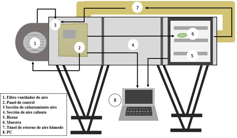 Este proceso se hizo en un secador de túnel con bandejas Espacio tiempo, HSB01, Perú, para controlar la velocidad y la temperatura de entrada de aire, el cual se calienta a través de resistencias eléctricas (Figura 1). Se utilizaron tres temperaturas en el estudio de la cinética de secado: 40, 50 y 60 °C, cada tratamiento se ejecutó por triplicado. El flujo de aire de secado se mantuvo constante a 2.0 ± 0.2 m/s y la humedad relativa de entrada fue de 68.08 ± 0.60 %. Se colocaron 460 ± 0.5 g de hojas como peso inicial para cada tratamiento sobre bandejas de acero inoxidable. La variación de peso se midió en una balanza analítica Ohaus SP402, USA, con una precisión de ± 0.001 g en intervalos de tiempo de 30 min. El tiempo de secado se determinó al registrar un peso constante (Przeor et al., 2019).