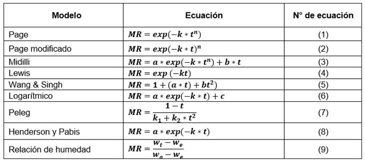 El proceso de secado, en términos de calidad del producto y costos de operación, se basa en la predicción de la velocidad de secado con la ayuda de modelos matemáticos adecuados. Los modelos matemáticos de cinética de secado se pueden clasificar en tres grupos: empíricos exponenciales, empíricos no exponenciales y los modelos de la segunda ley de Fick o difusionales. Con el modelado se intenta establecer un modelo real para simplificar y delimitar el proceso. En la Tabla 1 constan los modelos matemáticos empleados para modelar la cinética de secado de las hojas de muña (Babu et al., 2018).