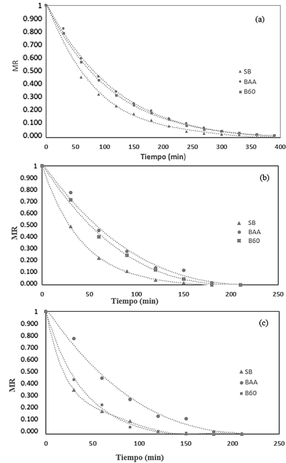 En la Figura 2 están las curvas experimentales del secado de las hojas de muña pretratadas y sometidas a tres temperaturas. Todas las curvas mostraron una clara tendencia decreciente con la relación de humedad