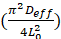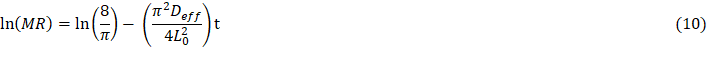 Para calcular el coeficiente de difusividad efectiva, se empleó la segunda ley de Fick, en la cual se describe de forma adecuada los fenómenos de difusividad en la transferencia de masa en la muestra durante el secado hasta llegar al equilibrio. Teniendo en cuenta que las hojas de muña son lo más cercano a una lámina infinita, la transferencia de masa es unidimensional con tiempos de secado largos. El modelo matemático se expresa en la ecuación 10:
