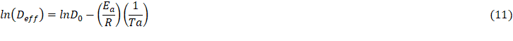 Por lo general, el coeficiente de difusividad efectiva del agua en los alimentos depende predominantemente de la temperatura de secado y presenta una tendencia tipo Arrhenius. Para evaluar la dependencia de las constantes empíricas en función a la temperatura, se empleó la ecuación linealizada de Arrhenius (ecuación 11). Los parámetros cinéticos energía de activación
