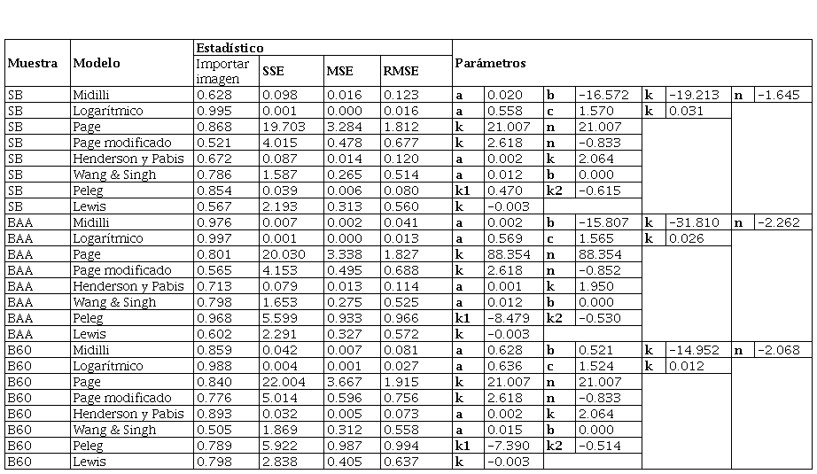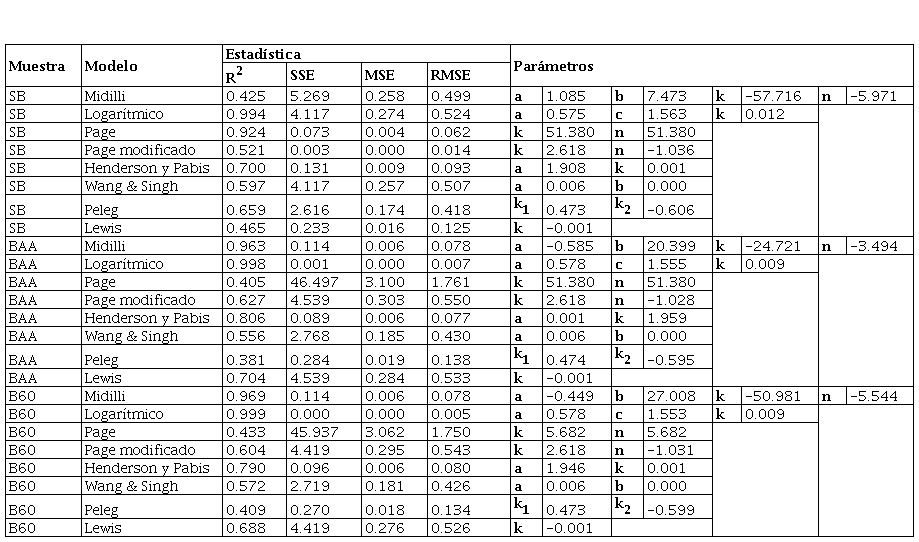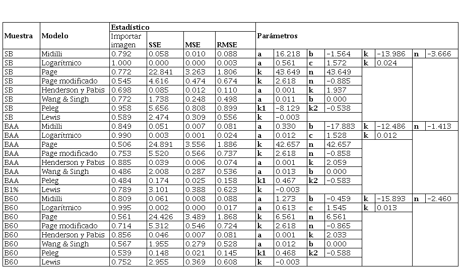 La bondad de ajuste de los modelos propuestos para la cinética de secado se evaluó mediante pruebas estadísticas que incluyen el error de suma cuadrada,
