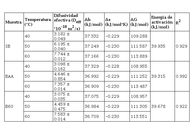 La relación entre el coeficiente de difusión efectivo y la temperatura del aire de secado permitió describir la energía de activación; además, el incremento en la temperatura del aire de secado ayudó a reducir los valores de entalpía y entropía específica, mientras que los valores de energía libre de Gibbs mostraron un comportamiento inverso.
