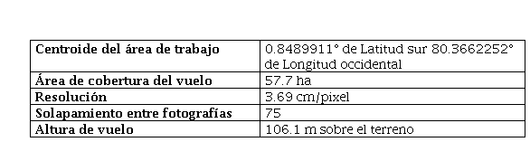 El procesamiento fotogramétrico completo de las fotografías RGB en el software PIX4Dmapper generó un vuelo corregido geométricamente, con una precisión de 2 mm, en un marco de referencia geodésico con el datum UTM WGS-1984, Zona 17 Sur, a una resolución espacial de 3.69 cm/pixel. Con este procesamiento se obtuvo el Ortomosaico, Modelo Digital del Terreno y nube de puntos en un tiempo de 48 minutos.