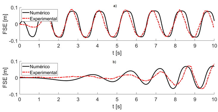 La elevación de la superficie libre (FSE), a través del tiempo del WEC fijado en la posición estable, simulando el estado E.O. 1 obtenida de la simulación numérica es comparada con las pruebas de flujo realizadas experimentalmente, como se muestra en la figura 5. Se toma como puntos de control dos puntos del dominio computacional, los cuales se encuentran a 4.77 m aguas arriba (figura 5a) y 2.04 m aguas abajo (figura 5b) respecto al centro geométrico de la boya. En rojo entrecortado se encuentran los datos del estudio experimental y en línea negra continua, datos del numérico realizado en el presente estudio.