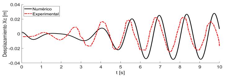 El desplazamiento del cilindro Xc en el numérico muestra un ligero desfase temporal respecto al experimental, en cuanto a la amplitud existe un error máximo del 6 %. En un lapso aproximado de 3s, los resultados oscilan de una forma irregular, esto se debe a que el dispositivo no alcanza la estabilidad al iniciar la simulación (Ransley et al., 2017).