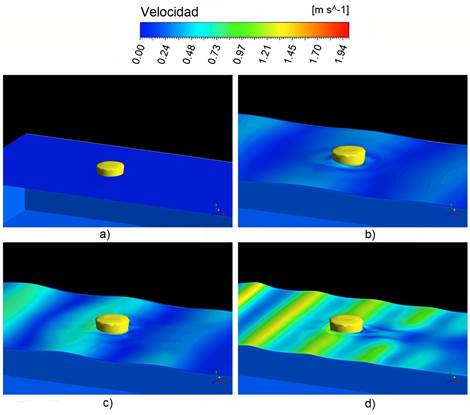 El libre movimiento del brazo del WEC con centro de giro en el punto pivote por la interacción con el fluido es ilustrado en la figura 7, donde se establece una isosurface bajo el criterio VOF= 0,5. Esta representa la elevación de la superficie libre del agua (FSE), mostrando contornos de velocidad del fluido alrededor de la boya.