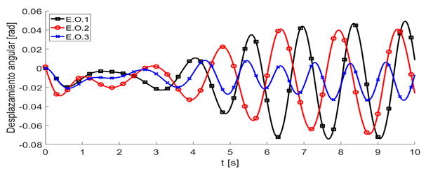 La respuesta del dispositivo, al impacto de las Olas sobre la boya, se ve reflejado en el desplazamiento angular (θ) del brazo del WEC con respecto al punto pivote. Durante las simulaciones se ha registrado a través del tiempo este desplazamiento (figura 8), partiendo desde el punto de flotabilidad estable se presenta la oscilación del brazo para cada prueba durante los 10 s simulados.