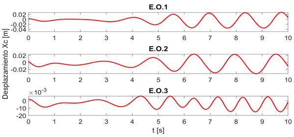 Estos resultados sugieren mejor desempeño del convertidor con los estados 1 y 2, los cuales presentan olas con períodos más largos. Asimismo, este desplazamiento angular es trasladado al movimiento lineal del cilindro hidráulico (Ecuación 5), donde se denota mejor transformación de energía desde las olas en E.O.1 y E.O.2 que en E.O.3. La figura 9 muestra el desplazamiento que se genera en el cilindro hidráulico Xc, en respuesta al movimiento del WEC provocado por el paso de los diferentes tipos de olas estudiadas, denotando las condiciones más favorables para la transformación de la energía a partir de las olas.
