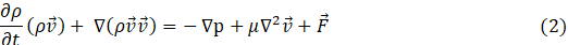 El flujo transitorio en el NWT es resuelto por simulación numérica directa (DNS) mediante ecuaciones de conservación de masa (Ecuación 1) y de cantidad movimiento (Ecuación 2) para flujo laminar.