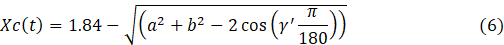 Con el WEC libre se controla un grado de libertad rotacional al registras la posición angular (θ) del centro de gravedad de toda la estructura cada time step respecto de la posición inicial del WEC. Dicho moviente de la boya provoca el desplazamiento del cilindro hidráulico (Xc) el cual se comprime y se extiende con el flujo de las olas transmitiendo aceite a presión al rotor. La ecuación 5, es la utilizada para trasladar geométricamente el movimiento de la boya hacia el pistón hidráulico. Las dimensiones y ángulos de interés considerados en el cálculo están presentados en la figura 1.