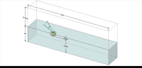 El tanque de olas, figura 2, donde se colocará el WEC para las simulaciones geométricamente es modelado con las siguientes dimensiones: 16 m de largo, 3 m de profundidad, 3.75 m de altura libre y 6 m de ancho. El dominio computacional del tanque es simplificado implementado un eje de simetría en la dirección de no incidencia de las olas. El sistema de conversión de energía será dispuesto en el tanque numérico, aplicando la simplificación propuesta por Windt et al. (2020) donde se coloca geométricamente solo la boya flotante, ya que es la única parte del WEC que entra en contacto directamente con el fluido; esta se encuentra instalada estratégicamente 4.97 m de la entrada del flujo y 2.6 m del fondo del tanque en la posición de flotabilidad estable, 0.4 m de la boya sumergida.