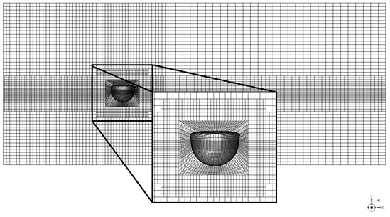 La malla propuesta presenta refinamiento en el área de influencia de las olas y las zonas cercanas al sólido para lograr mejor precisión del flujo y disminuir la cantidad de celdas necesarias para caracterizar el fenómeno. Esta se construye mediante celdas hexaédricas estructuradas mediante la técnica de mallado por bloques utilizando ANSYS ICEM CFD, la malla obtenida es mostrada en la figura 3.