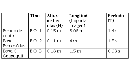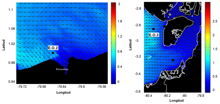 Las condiciones para E.O.2 y E.O.3 son escaladas 1:5 de los datos reales obtenidos tanto para la altura significativa como para el período promedio de los estados de mar típicos durante el mes de abril. Datos recolectados de las boyas virtuales en las zonas cercanas a las costas de Esmeraldas y al golfo de Guayaquil, respectivamente, figura 4.