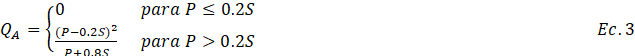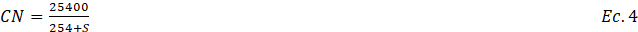 Donde Q. es la profundidad de la escorrentía; P es la profundidad de la lluvia; y S es Máxima Retención Potencial. La ecuación 3 asume que la abstracción inicial es 0.2S, aunque esta consideración está actualmente en revisión (Karpathy Nicholas y Chin David, 2019). La máxima retención potencial S es un parámetro abstracto que depende del tipo de suelo y uso del suelo en la cuenca. El CN se relaciona con S de la siguiente forma: