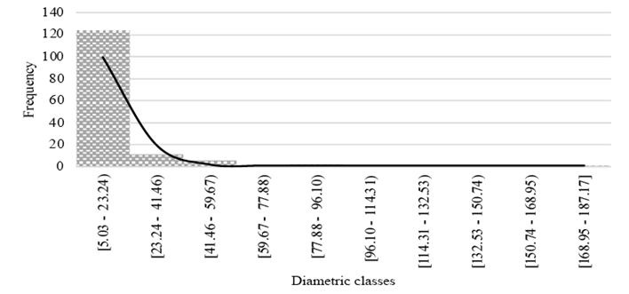 The diametric analysis resulted in a reverse J-shaped distribution (Figure 3)[18]. This distribution refers to the configuration of the diameter structure of a forest, where there is a predominance of young and small-diameter individuals, followed by a marked decrease in density in intermediate diameters, and finally, an increase in the number of individuals as the diameter increases. This curve represents a typical pattern of natural regeneration and development of the forest community [19].