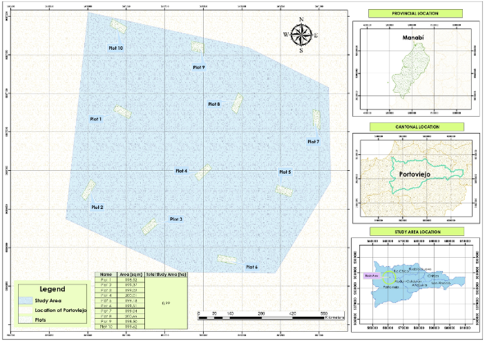 The study area is located in the forestal citadel at the southeastern of Portoviejo canton, in the province of Manabí, situated at coordinates -1.0187576 and -80.455844 (Figure 1). Field research was conducted during the period between July and August 2022. For data collection, 10 sampling plots measuring 10 x 20 m were established, resulting in a total area of 2 000 m2. In each plot, height and diameter at breast height (DBH) measurements were recorded for all trees with a DBH equal to or greater than 5 cm.