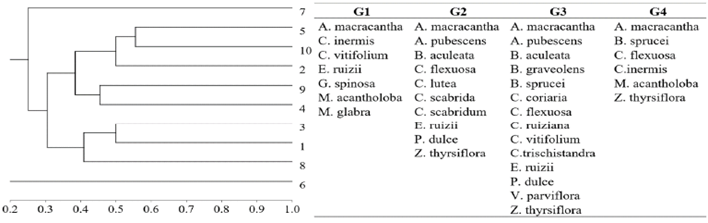 Certain species showed significantly high IndVal% values in specific groups of plots, suggesting a strong association with those specific communities (Table II). In this regard, it was observed that although A. Macracantha does not exhibit very high values, it is associated with the other species present in all groups, with a predominant tendency towards Group 4. C. Inermis, G. Spinosa, and M. Glabra displayed IndVal% values of 100 % in Group 1, demonstrating that they can be considered indicators of those particular communities.