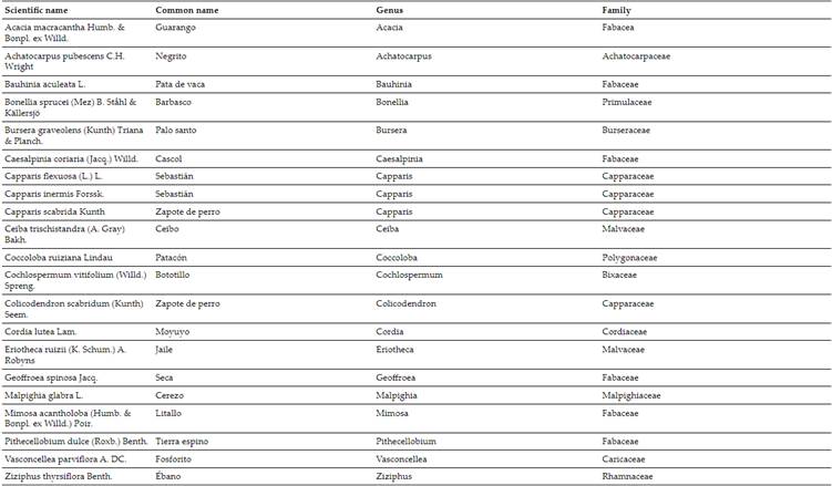 A total of 148 individuals belonging to 21 species within 19 genera and 12 families were identified (Table I). The Fabaceae family was the most diverse, with 44 individuals, followed by Capparaceae with 32 individuals, and Malvaceae with 25 individuals. Regarding abundance, it was determined that C. Flexuosa exhibited the highest absolute abundance (28 individuals) and relative abundance (19.18 %). This indicates that this species is dominant in terms of the number of individuals present in the study area. The species E. Ruizii, C. Flexuosa and A. Macracantha showed high relative frequency, suggesting that they are widely distributed in various plots within the dry forest area. On the other hand, C. Trischistandra displayed the highest absolute dominance (4.96 m² ha-1) and relative dominance (66.38 %), indicating that this species occupies a significant space within the forest and may have an important influence on the structure of the vegetation community. Furthermore, C. Trischistandra also stood out with the highest IVI value (77.39), suggesting that it plays a crucial role in the ecological balance of the dry forest.