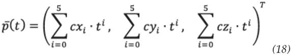 acting as boundary conditions: coordinates, velocity and acceleration values at the initial and final time points on each segment. Thus, the spatial motion law can be represented by three parametrized time-dependent polynomials of 5-th order (Eq. 18) [9], [11], [22]: