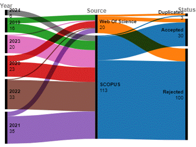 Fig. 2 illustrates the publication year of the studies on the left side, while the middle section displays the source repository of the articles. The number of selected articles is depicted on the right side of the diagram.