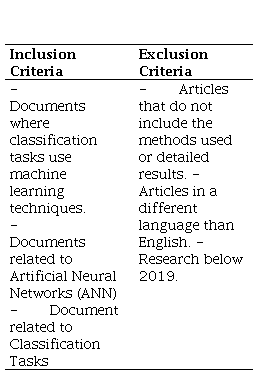To obtain screened records in this phase, both inclusion and exclusion criteria were established to ensure the systematic review's relevance and quality. Inclusion criteria focus on machine learning for classification, particularly ANNs, published in peer-reviewed sources from January 2019 to February 2024, ensuring the review covers current, credible, and detailed studies. Exclusion criteria remove studies without detailed methods/results, non-English publications, pre-2019 studies, review articles, theoretical papers, non-classification ANN tasks, and non-peer-reviewed works, to maintain quality, avoid language bias, focus on recent advancements, and concentrate on empirical applications. These criteria ensure that included studies directly address the research questions on ANN accuracy and applications in classification tasks. Table II outlines some of the relevant selection criteria that were included in the review, which led to the exclusion of certain records.