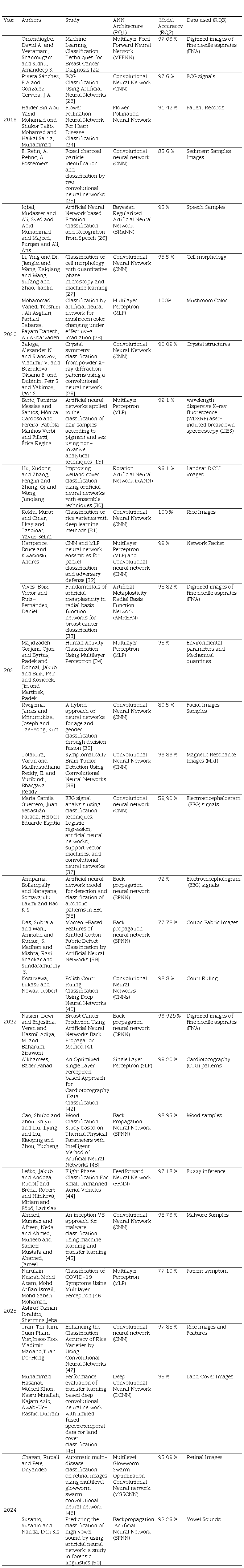 The most commonly used ANN architectures identified in this review are Convolutional Neural Networks (CNNs), Multilayer Perceptrons (MLPs), Feedforward Neural Networks (FFNNs), and Backpropagation Neural Networks (BPNNs). CNNs dominate in image-related tasks due to their ability to capture spatial hierarchies, while MLPs and FFNNs are versatile and effective for general classification tasks involving structured and sequential data. BPNNs, although less common, have shown significant performance in tasks requiring sequential processing.