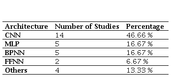 Table IV provides an overview of the prevalence of different artificial neural network (ANN) architectures used in the studies reviewed, first column lists the types of ANN architectures used in the reviewed studies, next column indicates the number of studies that utilized each type of ANN, last column shows the percentage of the total 30 studies that employed each ANN architecture