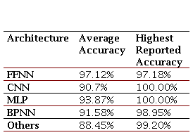 Table V showcases the averages and highest accuracies obtained by the different ANN architectures.