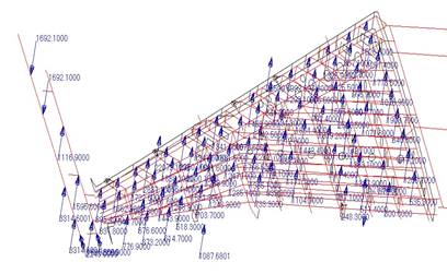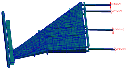 Available experimental results were obtained by applying discrete forces to the wing through hydraulic actuators, with applied load set equal to design limit load for the wing. This load is simulated in finite element (FE) model by applying nodal forces at the locations corresponding to the actuators. Fig. 4 illustrates the application of these nodal forces on FE model of the wing.