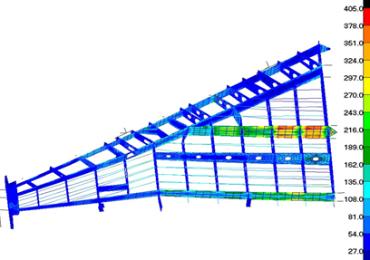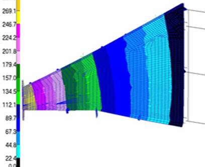 Finite Element analysis has been performed at design load. Pre- & Post processing is performed in MSC Patran while MSC Nastran is used as solver. Deformation field of wing under applied load is given in Fig. 5. Von-Mises equivalent stress in wing at design load is given in Fig. 6.