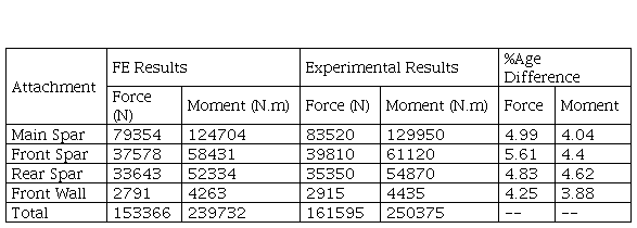 Table II presents comparison of reaction (forces and moments) at wing attachment for FE and experimental results. Both experimental and FE results corelate because maximum percentage difference between these results is less than 6 %