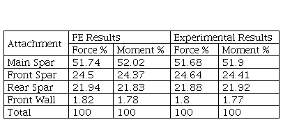TABLE III gives load distribution among wing spars from FE and experimental results. Both methods predict that main spar takes 52 % load, front spar takes 24 % load, rear spar takes 22 % and front wall takes 2 % load, approximately.
